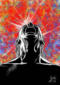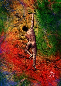Digital pen-and-ink drawings of half-bust figures in motion with themed digital backgrounds that correspond to verse superimposed on the backdrop, though not in the topmost layer, integrating it and showing that it is an intrinsic part of that background. These paintings are an attempt at moving forward from a darkness of the soul, though in some cases the futility of that attempt is implicit in the atmosphere generated by the backdrop and figure.